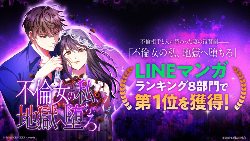 株式会社トゥーンクラッカーが原作・制作を手がけたオリジナル縦読み漫画『不倫女の私、地獄へ堕ちろ』が、LINEマンガで配信開始されるやいなや、なんと8部門で第1位を獲得したというニュースが飛び込んできました。これはすごい快挙ですよね!