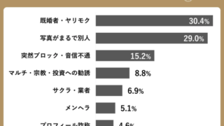 この結果を見て、皆さんはどう感じますか?上位2項目だけで全体の約6割を占めていることに、私も驚きを隠せません。マッチングアプリを利用した人の大半が、「既婚者・ヤリモク」か「写真詐欺」のいずれかに遭遇しているというのは、かなり高い確率ですよね。