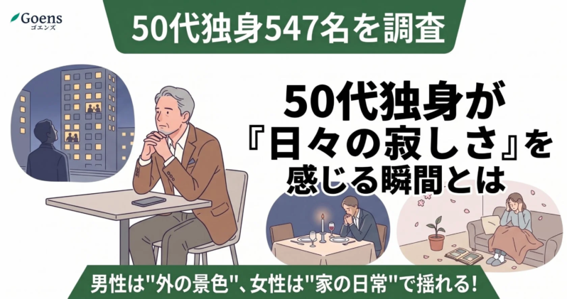 50歳以上限定のマッチングアプリ「Goens(ゴエンズ)」が行った調査では、全国のパートナーがいない50代独身男女547名を対象に、「一人の哀愁」を感じる瞬間と、新しい出会いの場に対する意識が明らかになりました。この結果から、50代独身の方々がどのような瞬間に寂しさを感じ、そしてその先にどのような行動を考えているのか、そのリアルな内面が垣間見えます。