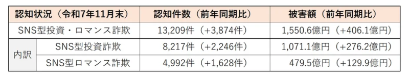 警察庁の最新データ(令和7年11月末暫定値)を見ると、デジタル空間の危険性が数字としてハッキリと現れています。2025年1月から11月までのSNS型投資・ロマンス詐欺の認知件数はなんと13,209件!被害総額は1,550.6億円にも上るそうです。これは本当に「大ごと」ですよね。